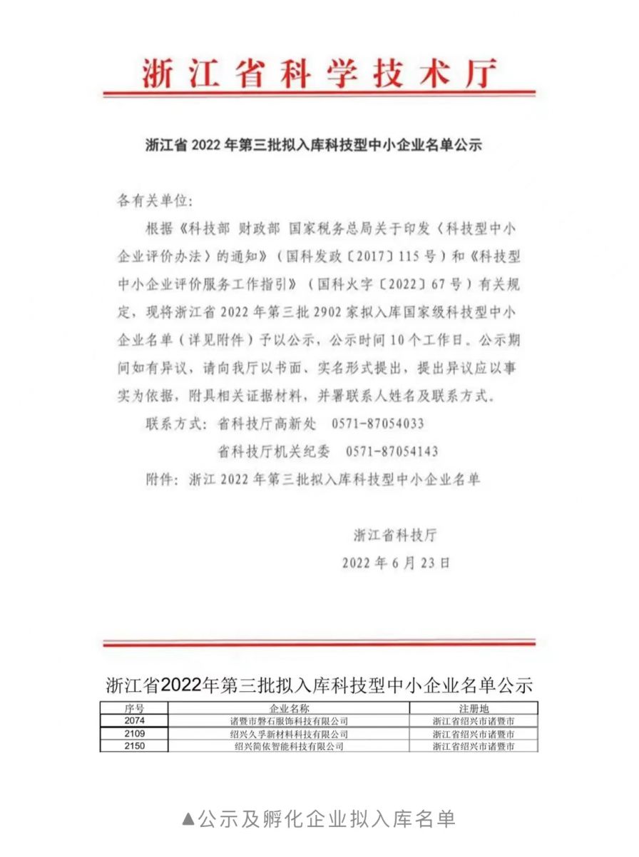 近日,浙江省科技廳下發(fā)了《浙江省2022年第三批擬入庫科技型中小企業(yè)名單公示》。其中,位于諸暨市的紹興久孚新材料科技有限公司入選。